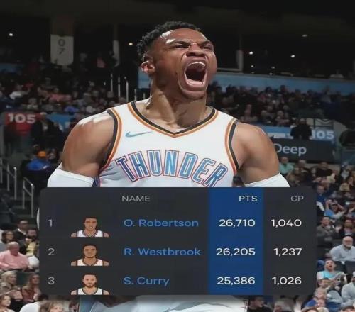 值得一提的是,目前威少NBA生涯總得分為26205分,暫時(shí)位列聯(lián)盟史上第20名,高居控衛(wèi)位置第二名,僅落后頭名的奧斯卡-羅伯特森(26710)505分。