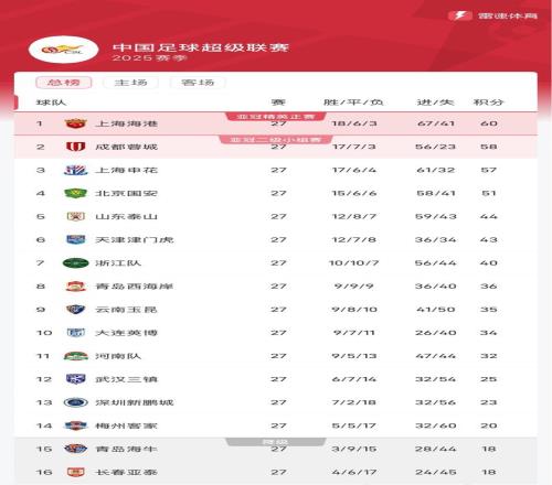 中超聯(lián)賽最新積分榜:海港2分優(yōu)勢領(lǐng)跑,海牛、亞泰深陷降級區(qū)
